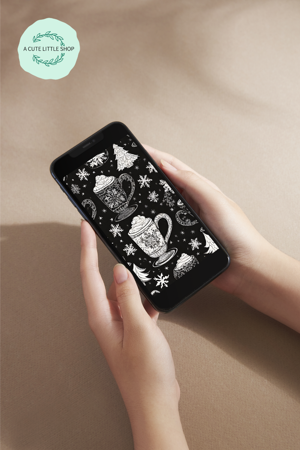 Set your iPhone background to these patterns of gothic style Christmas Hot Chocolates! Each image contains a pattern of gothic-style Christmas hot chocolate drinks, with a muted colour palette of black, white and grey with the occasional pop of holiday red.